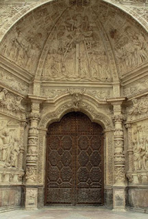 los tres grandes arcos abocinados de piedra del pórtico de entrada no se